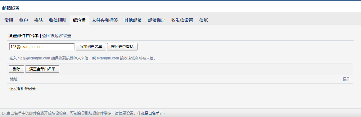 2.輸入完整的地址,如“123@example.com或者example.com”,然后點(diǎn)擊“添加到白名單”按鈕,即可。