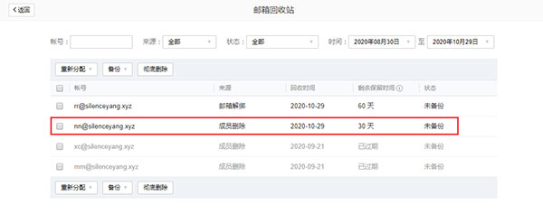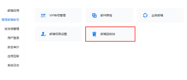新版郵箱,可在刪除郵箱30天內(nèi),管理工具-管理郵箱帳號-郵箱回收站分配給成員。(舊版郵箱,可在刪除郵箱7天內(nèi),系統(tǒng)日志-操作記錄恢復(fù)該賬號)